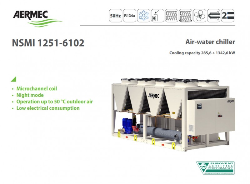 NSMI is a single or dual circuit chiller loaded with R134a gas, axial fans, one or two twin-screw compressors, one of which has an inverter, a shell and tube exchanger, electronic valve and "V block" microchannel coils. The units are designed to provide high yield at full load, and very high efficiency at partial loads, with the increasingly optimised compression yield of the inverter compressor. It is available in the high efficiency and high efficiency silenced version; some available options include a desuperheater, for the recovery of part of the resulting heat during cooling, inverter fans, single or twin pumping units, and any special treatments or operations of external coils for use in aggressive environments.