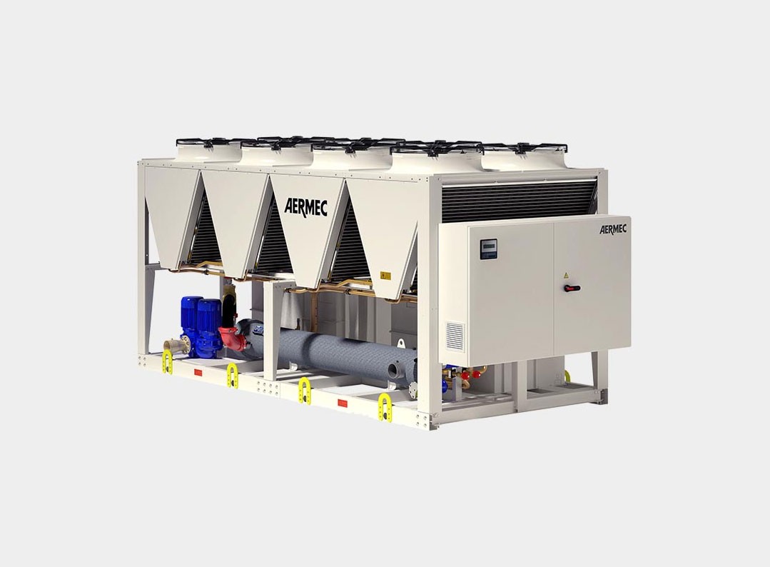 Air-water chiller for external installation with a twin-screw inverter compressor, suitable for large users of air conditioning in buildings for residential, commercial and industrial use.