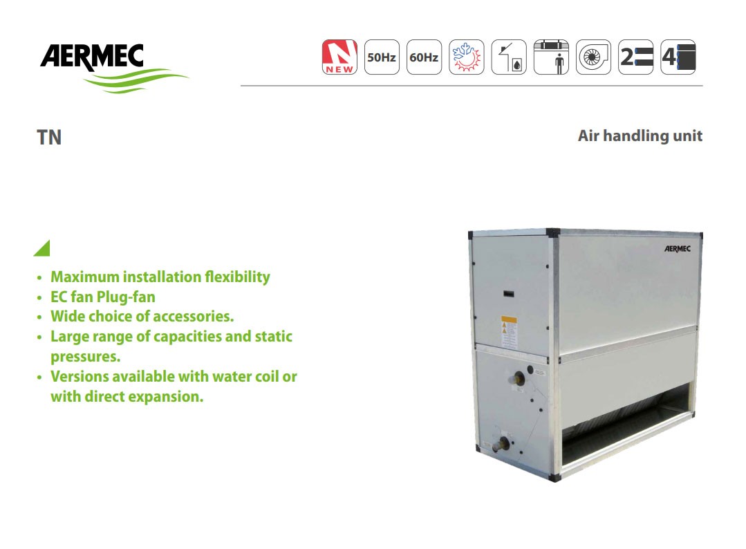 TN is an alternative to the fan coil units when only filtering, air cooling or air heating is required. Top performance is ensured by high-efficiency copper/aluminium coils of 4 or 6 rows, that can be combined with post-heating coils of 2, 3 or 4 rows. The machine is also fitted with dual-suction centrifugal fans with forward blades for high head levels, coupled with electric motors by means of a belt and pulley with variable pitch. The air is filtered by synthetic G4 filters positioned on the suction line; they can easily be removed for maintenance and cleaning. Alternatively, the FTMxT accessory uses class F7 filters.